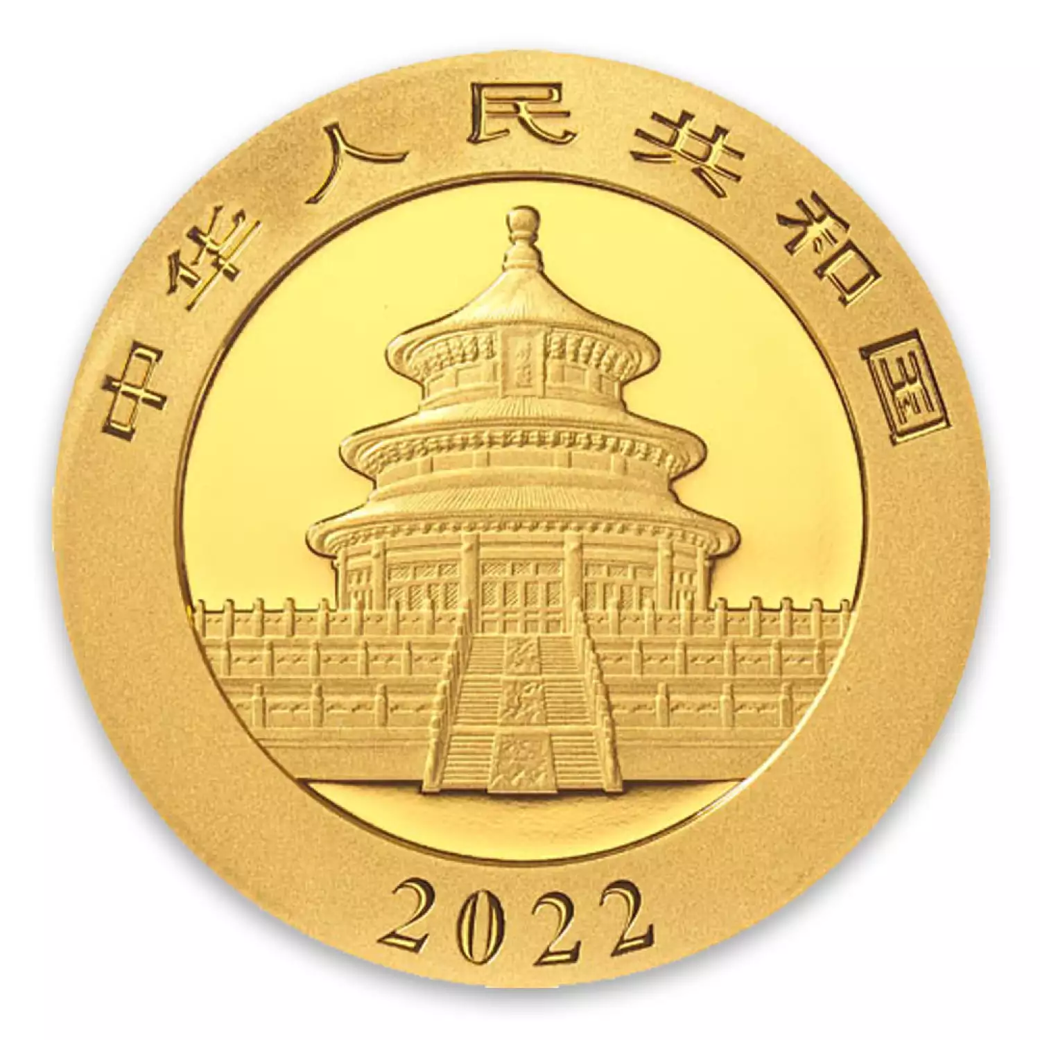 The 2022 8g Chinese Gold Panda coin is minted as .999 fine gold, 24 karat. The Chinese Gold Panda Coins differ from most other common gold bullion in two ways. First, the reverse design of the endangered panda bear changes annually (except for 2001 and 2002 which feature the same design) and second, each coin is minted as a limited edition. First minted in 1982, the Chinese Gold Panda Bullion Coin was greeted with great interest among collectors. This interest peaked in 1987 after which lower mint figures resulted in limited availability. The design of the Panda changes each year.