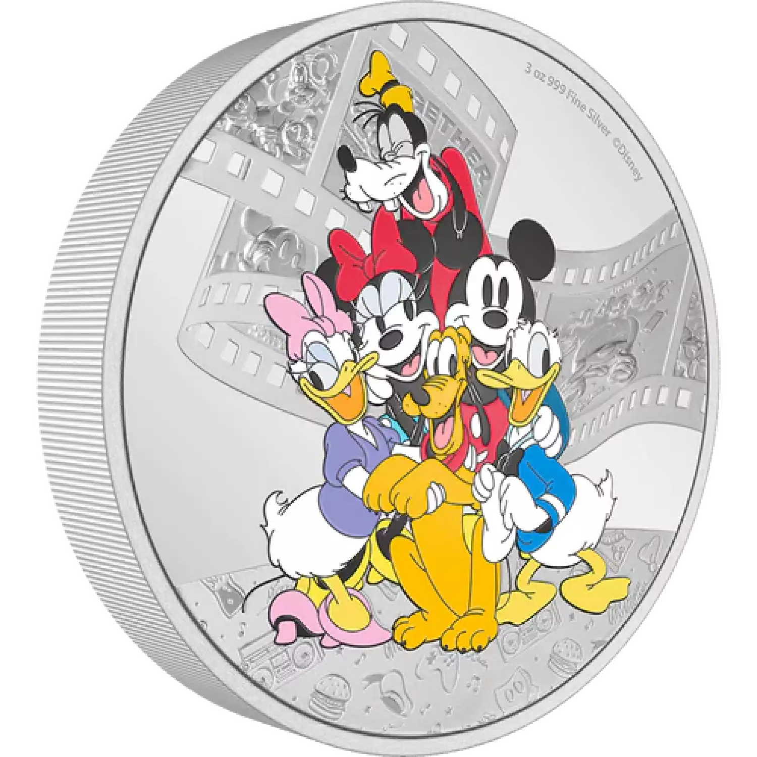 This magnificent 3oz pure silver coin features a coloured image of Disney’s Mickey & Friends, in a warm embrace. Behind them is a frosted film scroll showing some of the crew’s fun adventures. Some charming motifs have been engraved along the bottom of the coin, and to top it off, there is a beautiful mirror-finish background. It sure is swell!