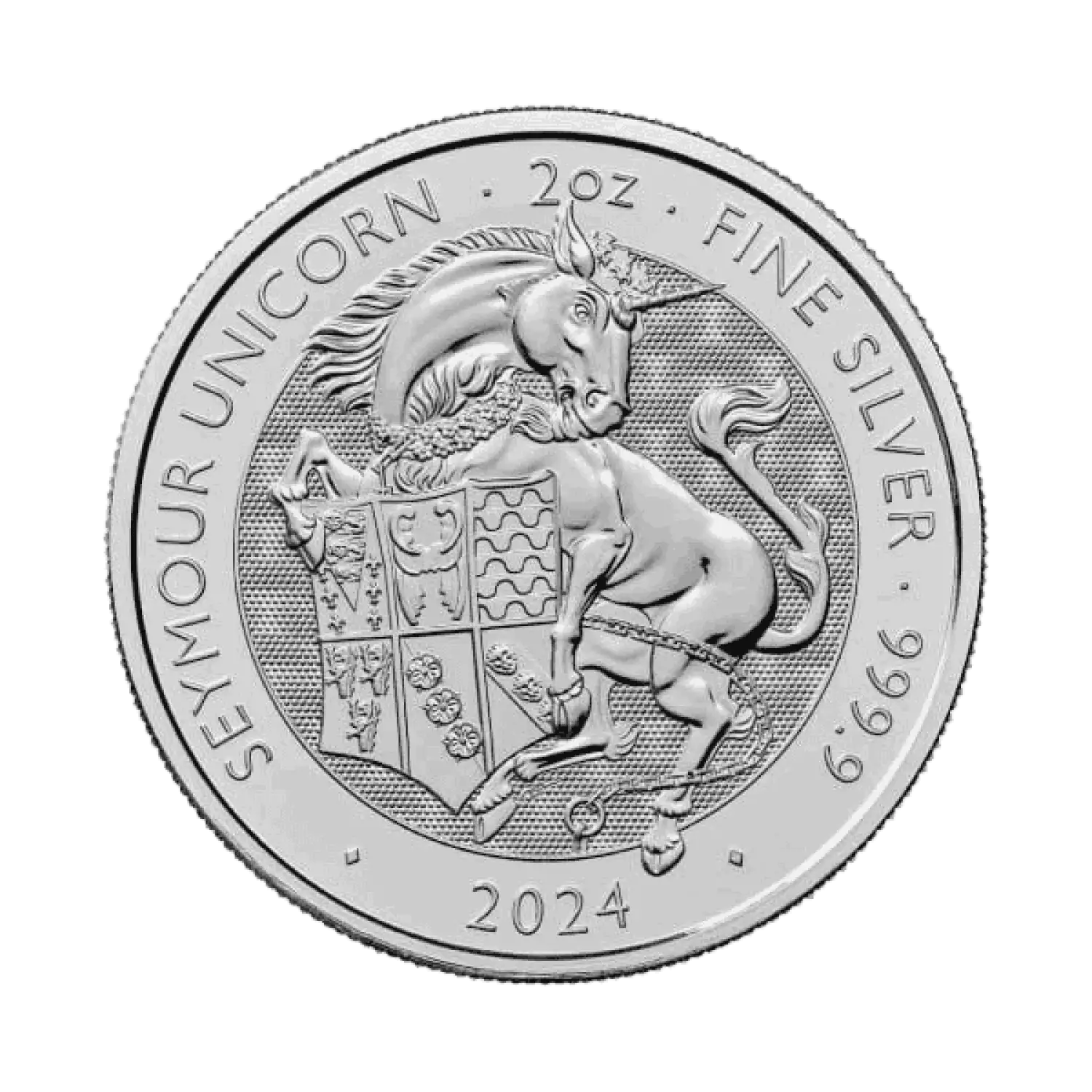 Explore the captivating tapestry of British history with the 2024 2 oz British Silver Royal Tudor Beasts Unicorn Coin. This finely crafted coin boasts the effigy of King Charles III on the obverse, an artistic masterpiece by the renowned Martin Jennings. On the reverse, you'll encounter the entrancing Seymour Unicorn, a creative depiction skillfully crafted by the talented David Lawrence.